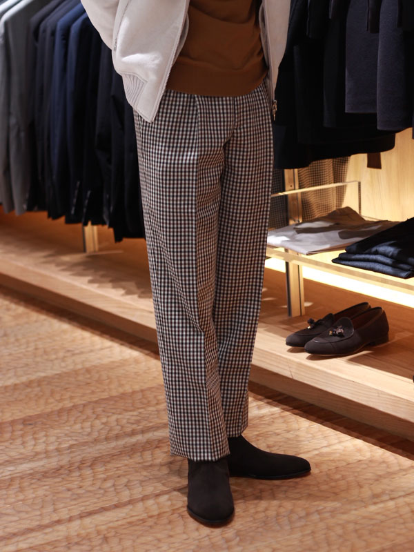 個人的にイギリスのカントリー調のスタイリングが気分なので、新ブランドのオルテロから入荷したガンクラブチェックをチョイス。
