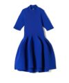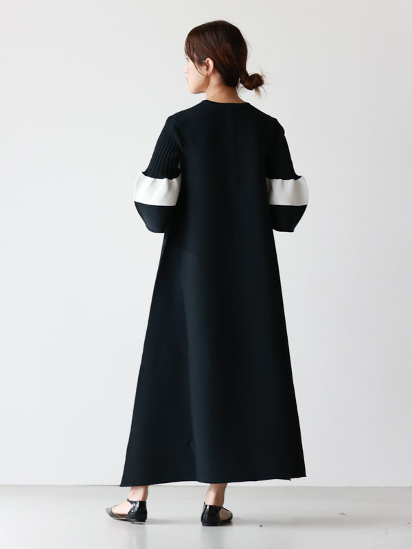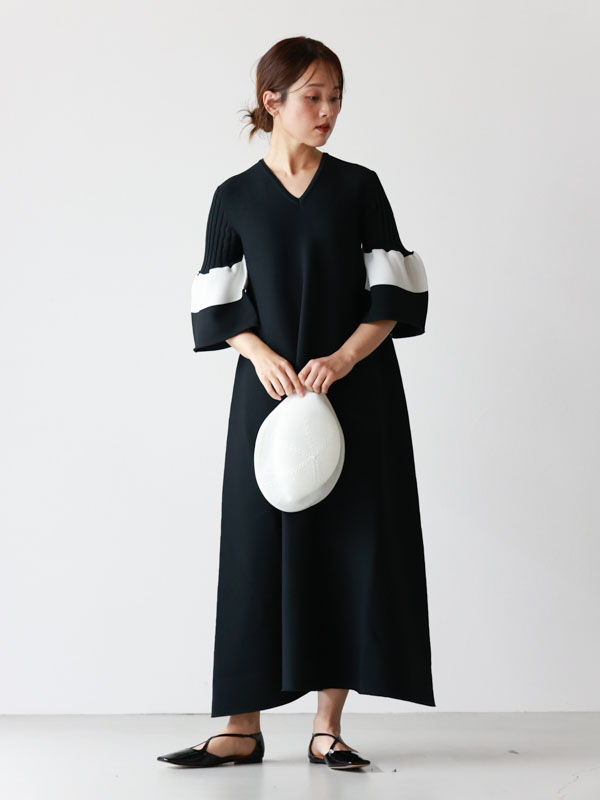 袖のバイカラー配色のさりげないラメがポイントで、普段使いはオケージョンシーンにも活躍できるワンピースです。ボディラインを拾わないフレアのシルエットで今の季節に一枚で主役になるアイテムとなっています。