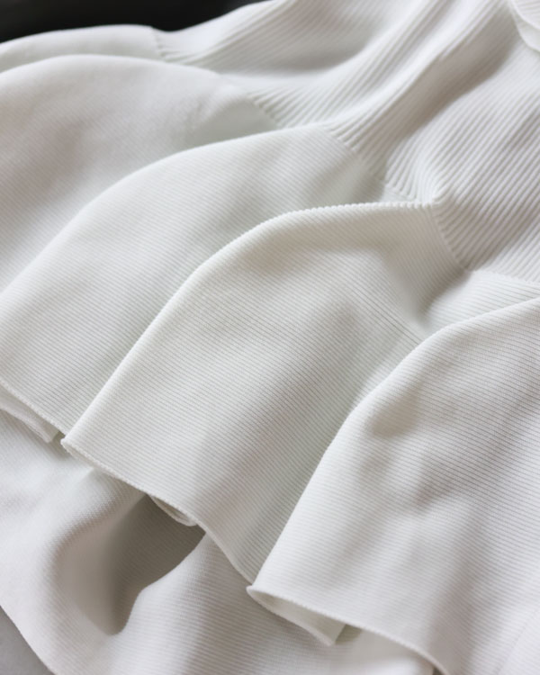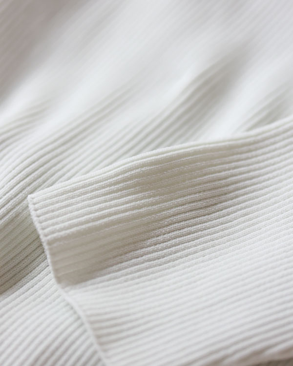 全体が細かいリブになっているので、自分の身体の形に馴染むようなフィットして、着ていて窮屈な印象は全くありません。伸縮性もかなりあるので長時間でも安心して着用いただけます。