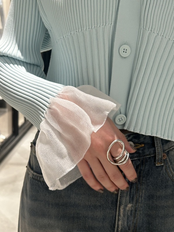 人気のカーディガンですが、今季は袖口がシアー素材になっているのがポイントです。