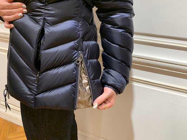斜めに入ったキルティングで他モデルにはないシャープなイメージ。ジップ部分はシンプルな仕様でスポーティーな雰囲気です。