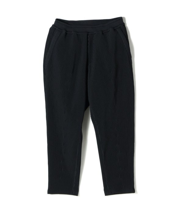異なる2種類のリブを交互に組み合わせたユニークなシルエットが特徴。爪先やかかとなど負荷がかかる部分は再生ポリエステル、それ以外は汗を吸収しやすく肌触りのよいコットンを使用しています。見た目はユニークですが、着用するとスタイリングしやすいオーソドックスなシルエットになるアイテムです。