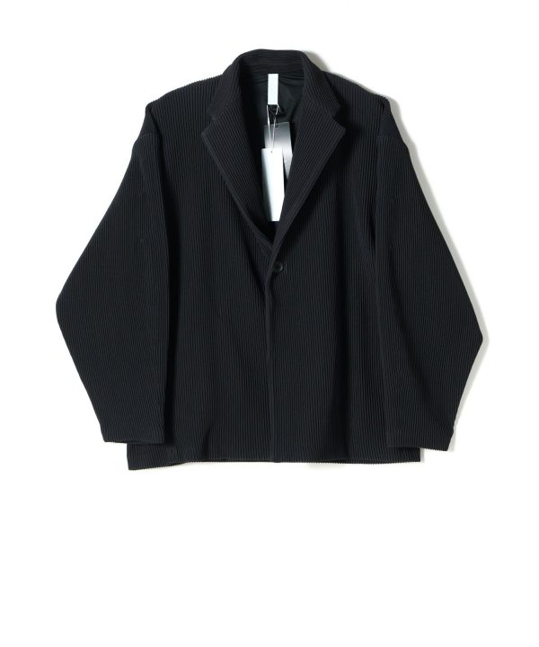 立体感のあるストライプの編み地は、見る角度によって表情が変わり、奥行きのあるデザインを演出します。プログラミングによるダーツ設計が、身体を包み込むような独特のフォルムを生み出し、ミニマルでありながら印象深いデザインに仕上がっています。1つボタンのシンプルな留め具が、都会的でソリッドな印象を際立たせます。