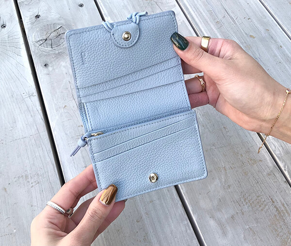 ミニウォレットは、スナップを開けると、メインコンパートメント1つ、ジップポケット1つ、グラフィックなタッチを添える斜めカットのカードスロットが5つございます。