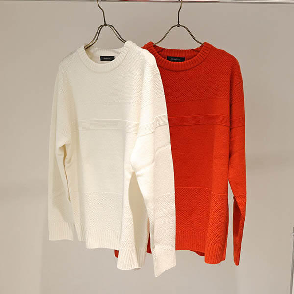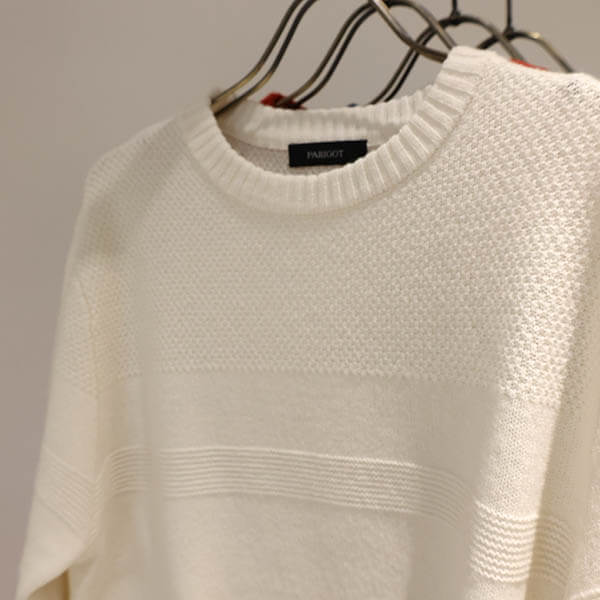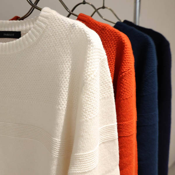 PARIGOTのオリジナルニットはシンプルなデザインながら4色と豊富なカラー展開と、織り柄で表現したボーダーが大人の方に人気の一枚です。