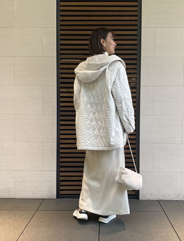 アウターは暗い色味が多い方もホワイトをチョイスすると印象がまたグッと変わりますよ!