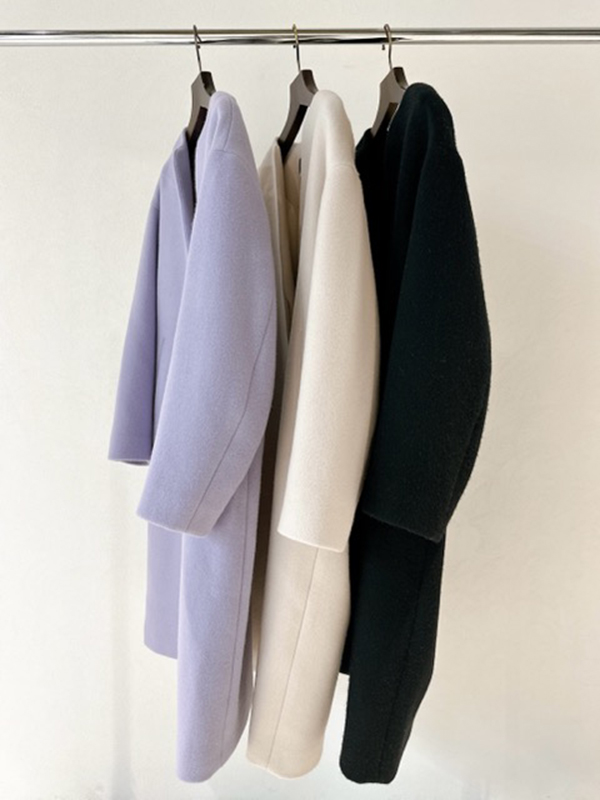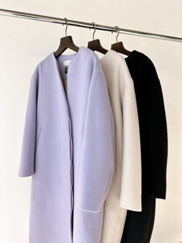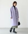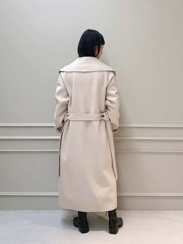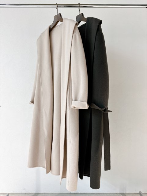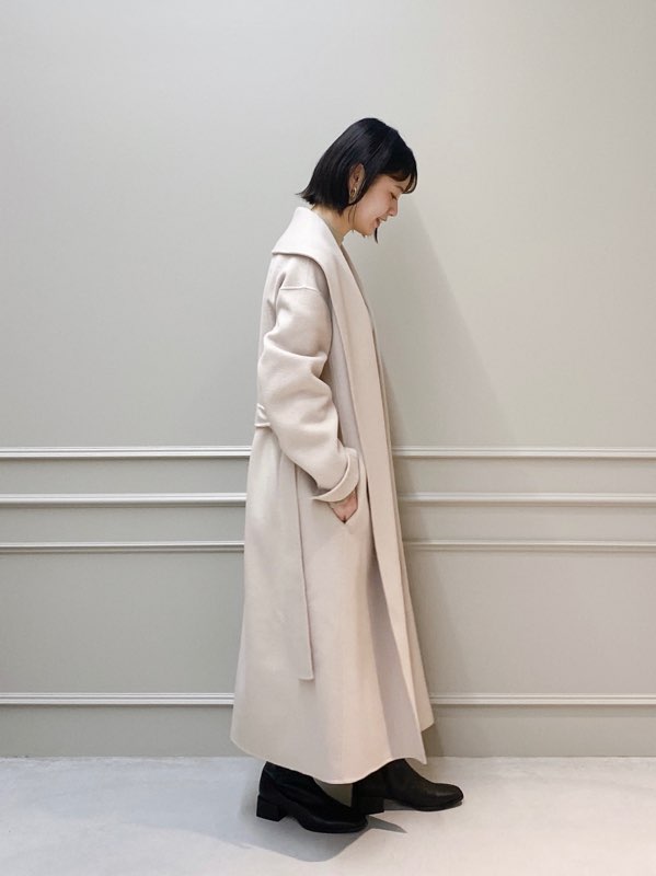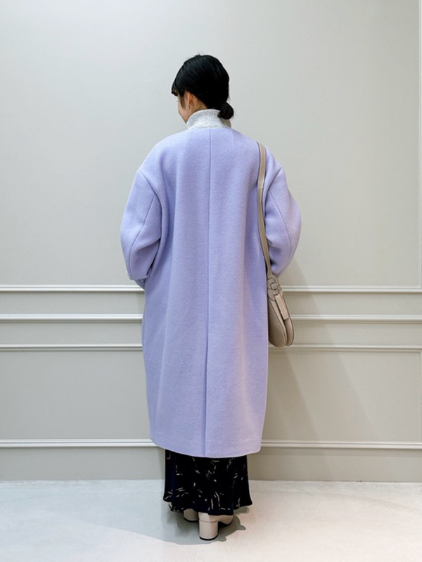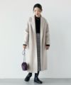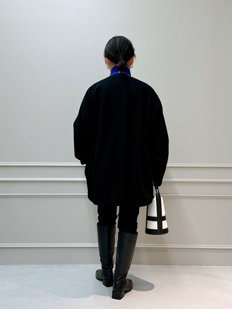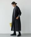 こちらはキーネック風なシャープの襟元が特徴的で、ドロップショルダーをあしらったオーバーサイズコートです。