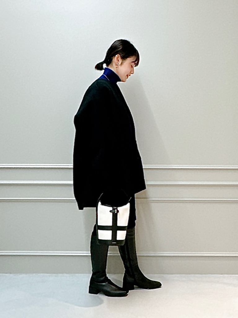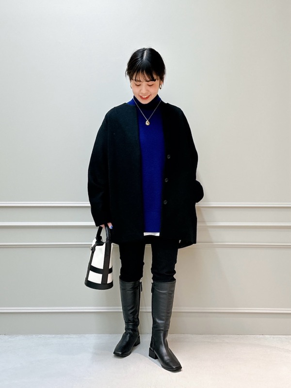 ブラックをベースとしてかっこよくまとめてみました。インナーはニットとカットソーをレイヤードして、コートを脱いでもお洒落な着こなしです。