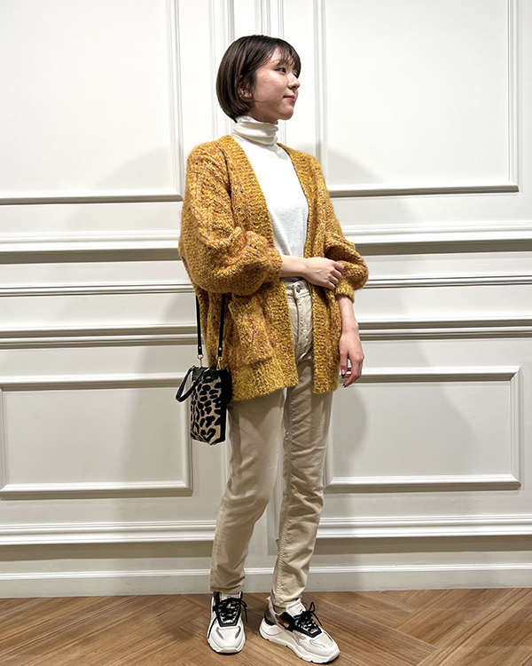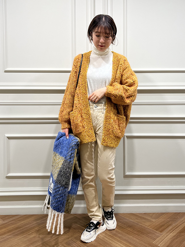 アクティブなイエローのニットに、キレイ目ベージュのパンツを合わせる事で、大人カジュアルスタイリングに仕上げてみました!