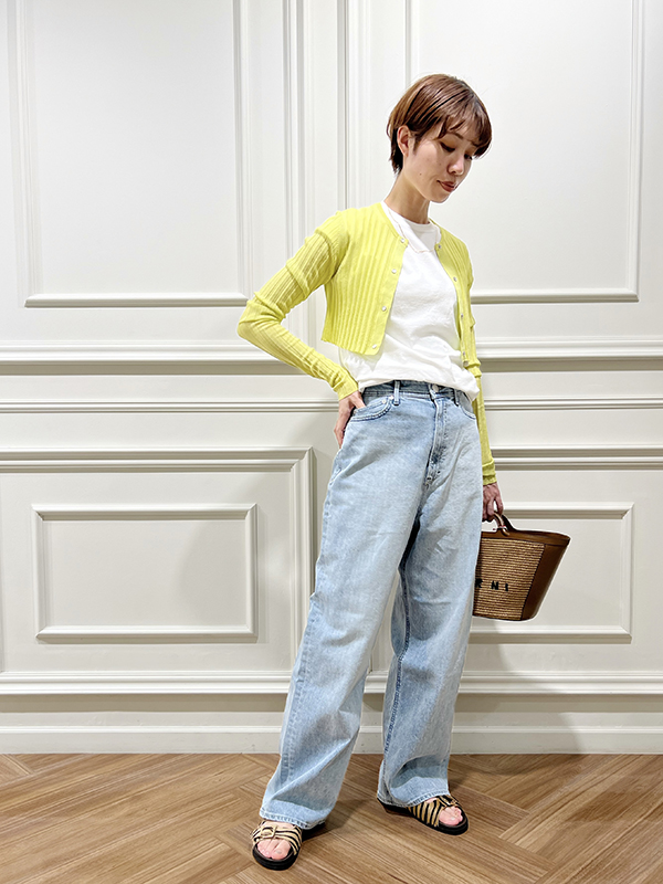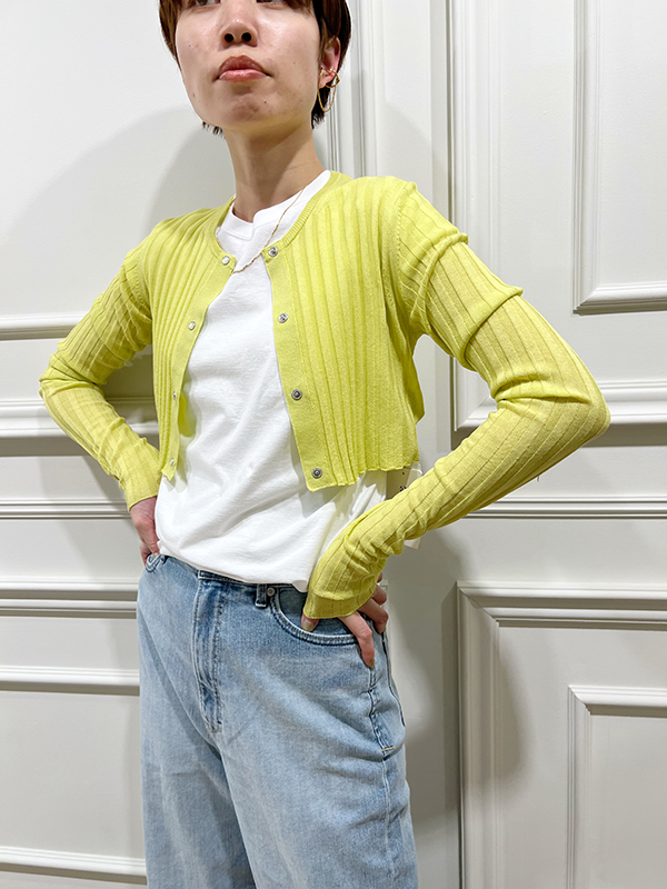 今回は、INSCRIRE(アンスクリア)のニットカーディガンのイエローを差し色に、気分の上がるカラ―コーデを組んでみました。