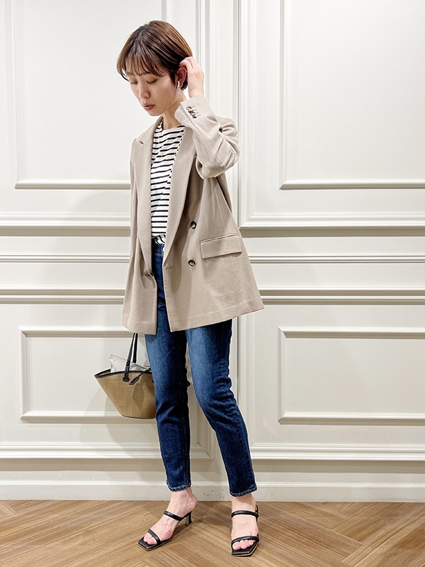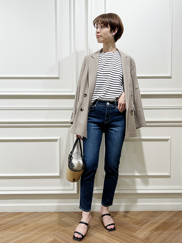 きれいめな印象でお召しいただけるので、ジャケットとヒールを合わせて女性らしい着こなしに仕上げてみました♪デニム慣れしていない方でも、このシルエットとカラーであれば取り入れやすい思います♪