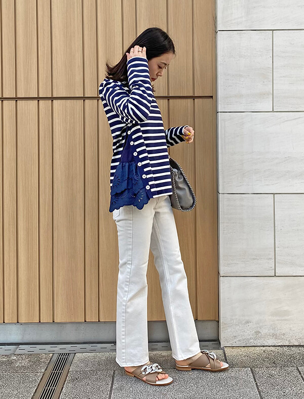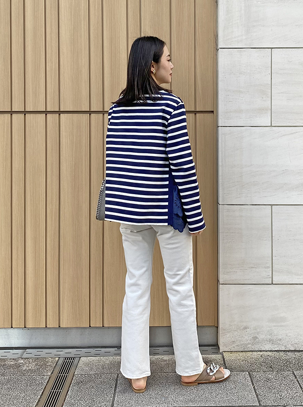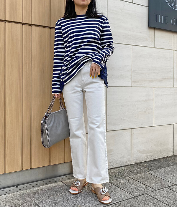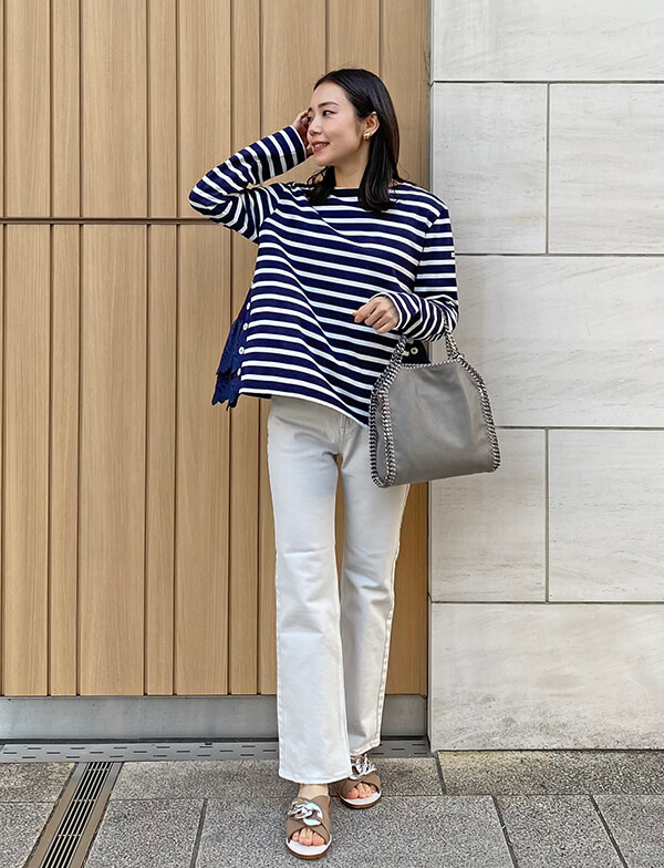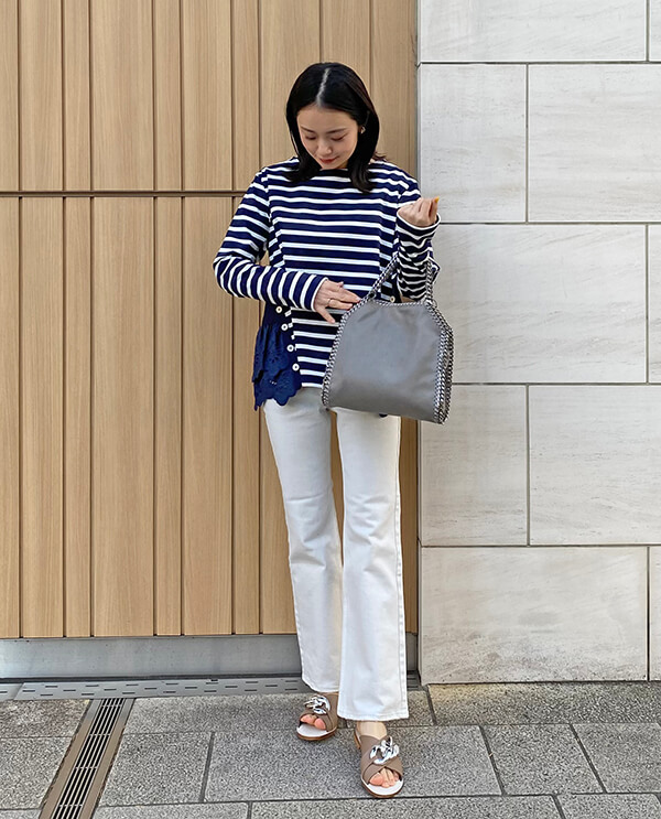 ボーダーのトップスとのシンプルな合わせですが、フレアパンツだとおしゃれ感が出ますよね!