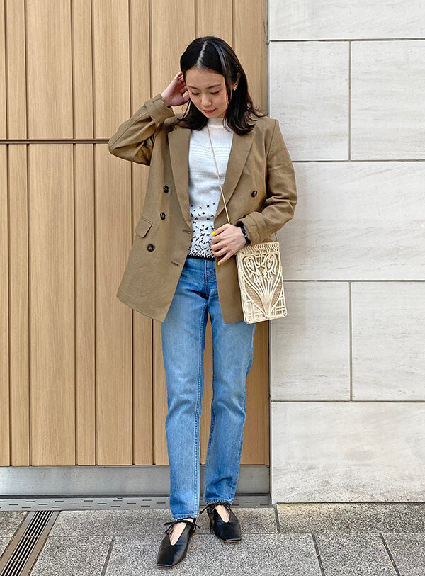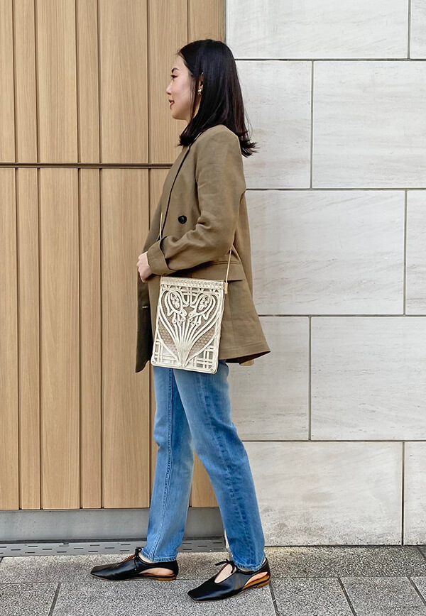ニットやバッグはMame Kurogouchi(マメ クロゴウチ)で合わせて、マニッシュな中にも女性らしさをプラスしました!