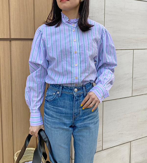 Isabel Marant Etoile(イザベルマランエトワール)のシャツのインポートらしい鮮やかなカラーに、ヘルシーなデニムのブルーがよく合います♪