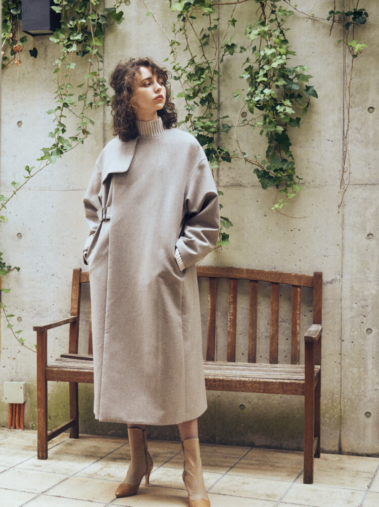 HYKEのCollarless Trench Coatを元に、パリゴ限定素材にて別注したノーカラーのトレンチコート。