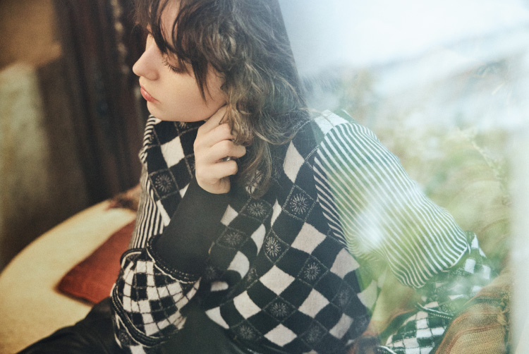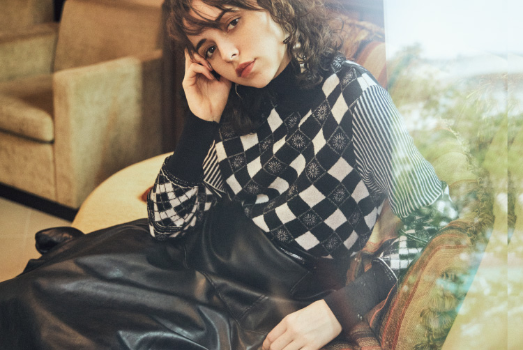 「日本の伝統的な籠やその編み地にインスパイアされたグリッド模様がジャガードで表現されたニットトップ。視覚的に体を包み、守る籠を表現しています。落ち着いたトーンになりがちな秋冬ですが、この別注品はグラフィカルなモノトーンなので、1枚でもレイヤードでも様々な着こなしが楽しめます。」