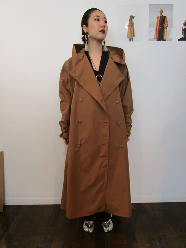 大きな衿やフード、ウエストのドローストリング使いでスポーティーながらモードな印象に。