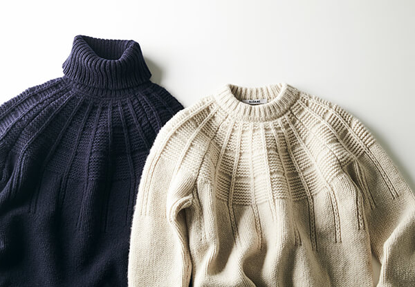 カラーネップや麻をラムウールと編んでいることで、ニットへ独特の表情が生み出されます。