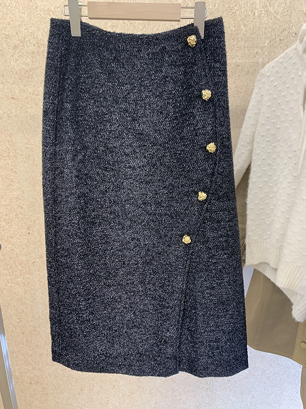 フロントのカッティングとボタンディテールが素敵なスカート。
