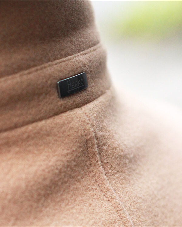 コーディネートを問わずにオンオフ使用できる優れもので、チェスターコートの襟の裏にはヘルノのブランドタグがあり遊び心のある一品です。