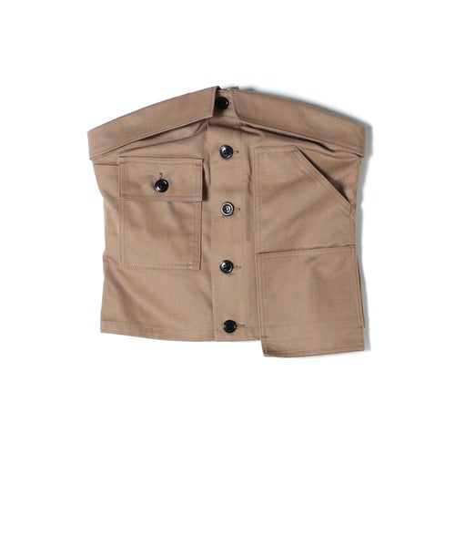 ワークウェアの要素を取り入れたビスチェトップス。直線的で無駄のないストラップレストップのデザインが特徴で、レイヤードスタイルにモードなアクセントをプラスしてくれます。