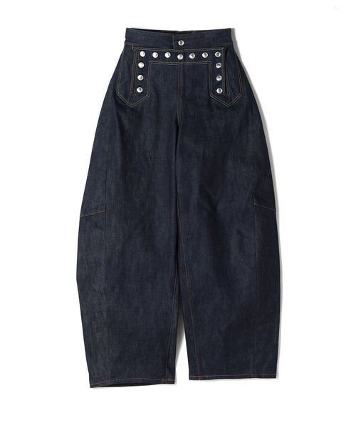 ウエスト周りのシルバーボタンが印象的なバレルレッグデニム。40年代の U.S.NAVY WOOL SAILOR PANTSからインスピレーションを得てデザインされたデニムは、現代的なマリンルックとして提案されています。