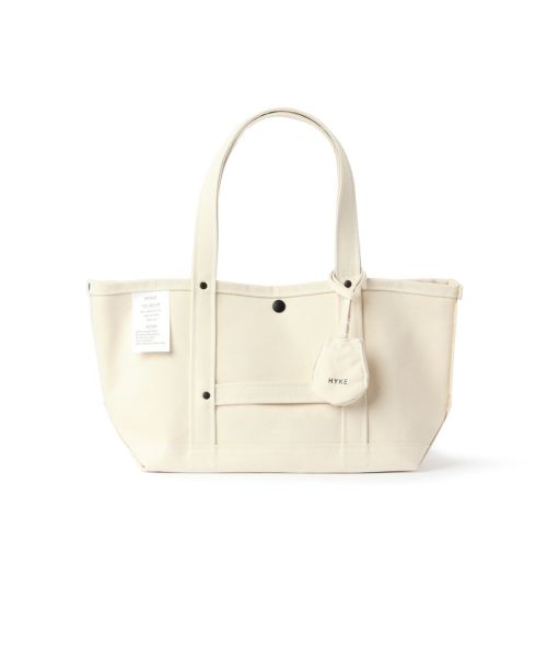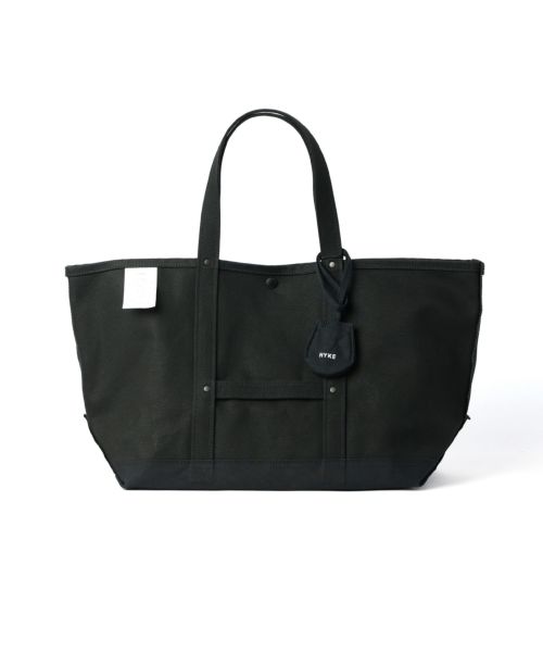 HYKE(ハイク)のバッグ。1950年代のツールバッグから着想を得たトート型デザインで、無駄を削ぎ落とした佇まいが印象的です。直線的でクリーンなシルエットは、持つだけでスタイリング全体を引き締め、カジュアルにもきれいめにも自然に馴染みます。ワーク由来の実用性を感じさせながらも、HYKEらしい静かな存在感があり、デイリーに使いやすいバランスに仕上げられています。