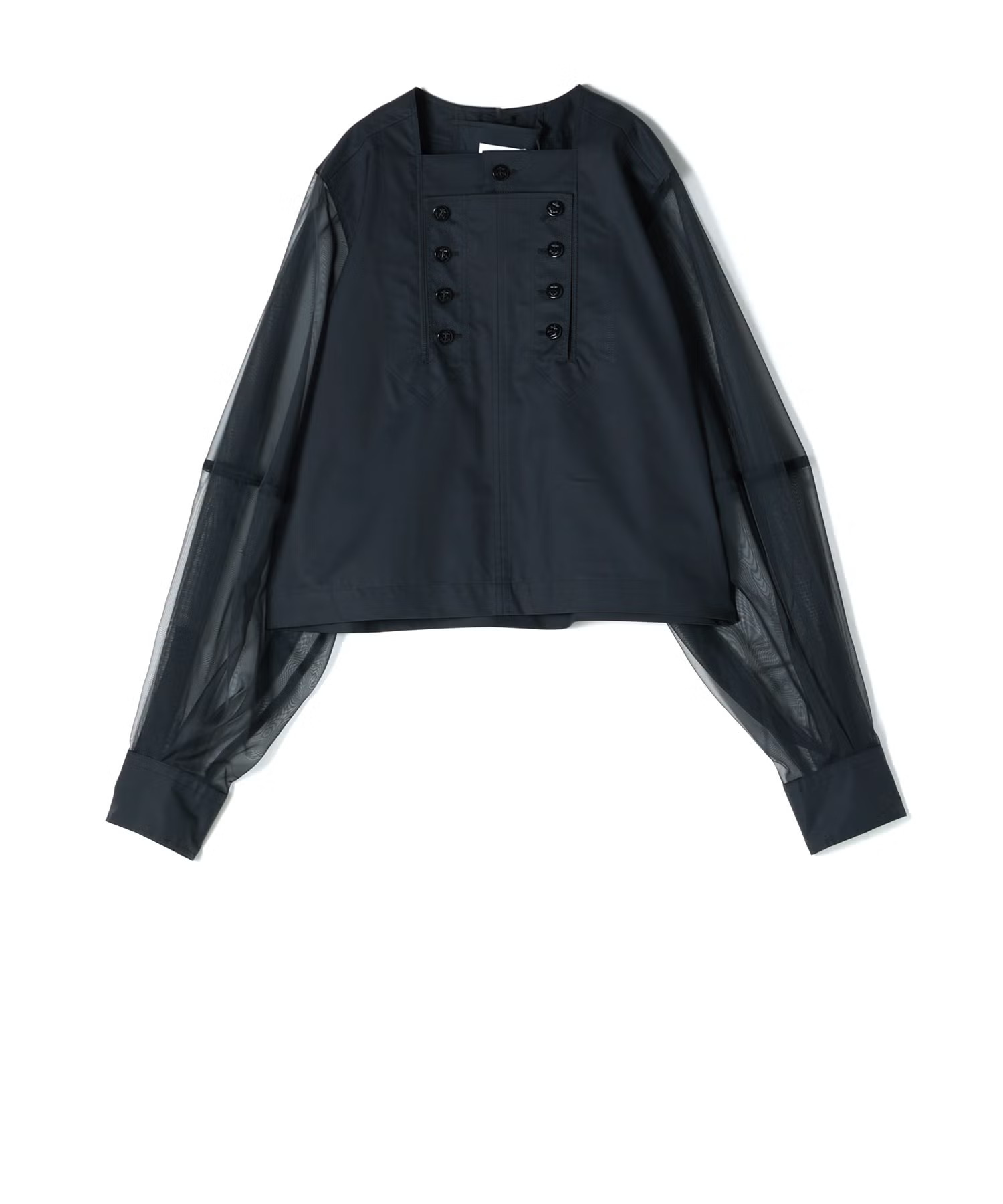 理事っとシリーズと同じくデニムとボイル素材をドッキングさせたデニムジャケット。洗いのかかったデニム素材は春らしい軽さを持った印象に仕上がっています。