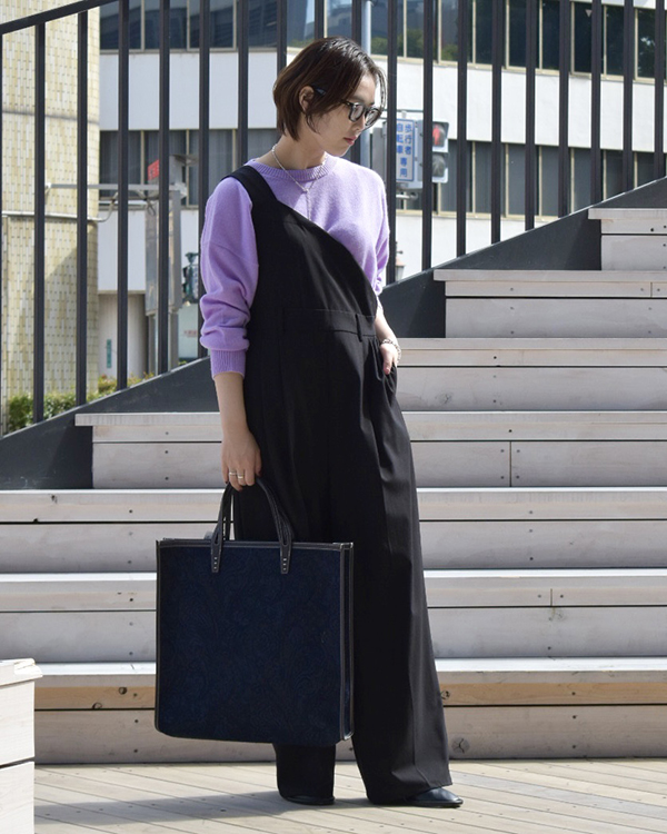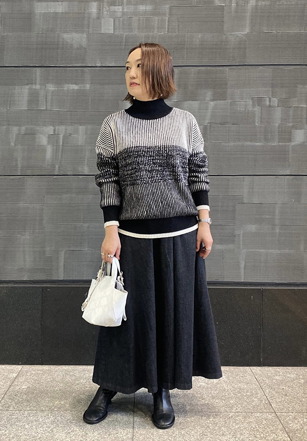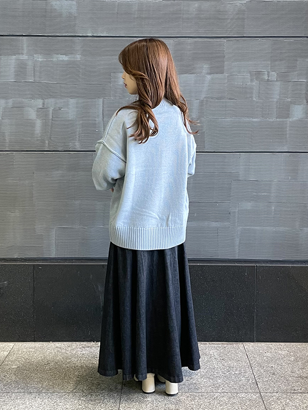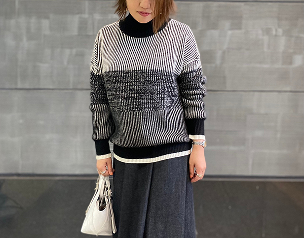 ボリューム感のあるニットですが、裾に広がりがないシルエットなので細身のボトムスだけでなく、ワイドパンツやスカートとも相性が良いです!
