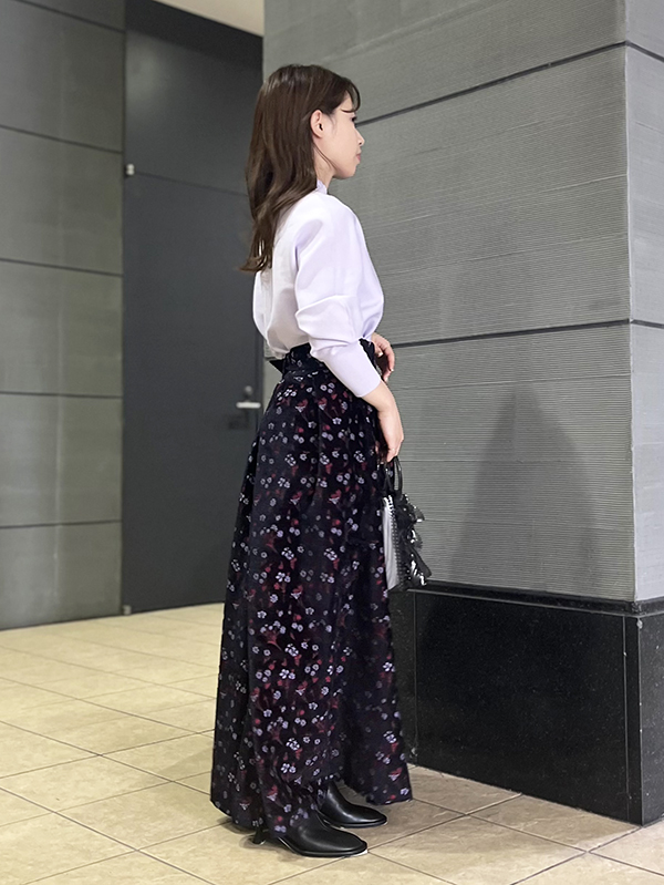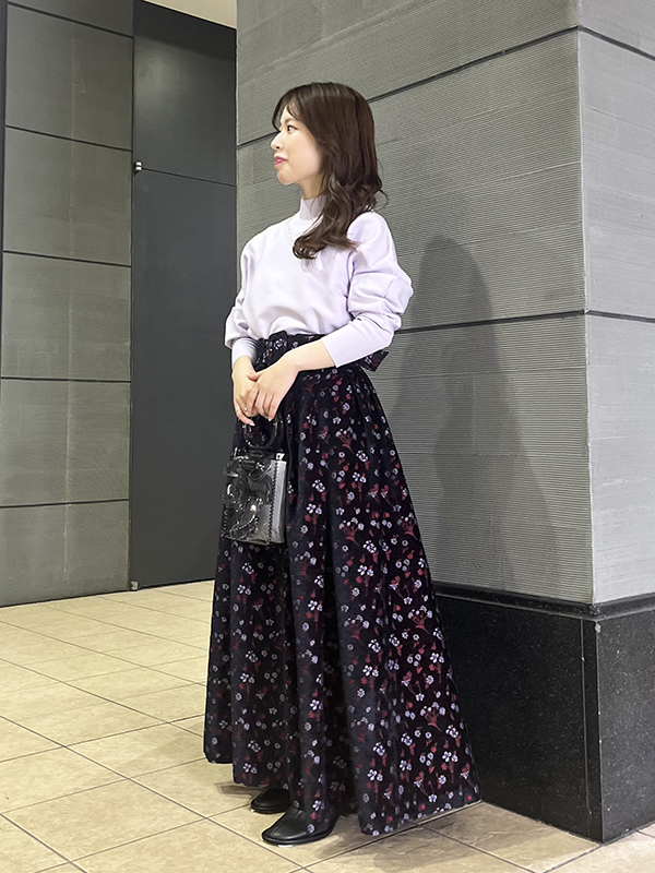 上品なお色のラベンダーカラーのトップスと華やかな柄のスカートを合わせ、統一感のあるカラーバランスを意識してコーディネートを組んでみました!