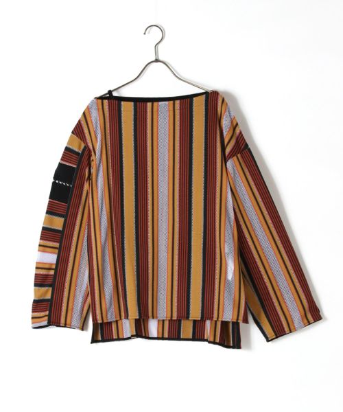 Mame Kurogouchi(マメクロゴウチ)のニット。鎖骨を美しくみせる曲線の襟ぐりやアシンメトリーでカシュクールを着ているかの様な柄の重なりが1枚で立体的な奥行きを演出。竹の繊維を思わせるストライプを多素材の組み合わせで表現しています。