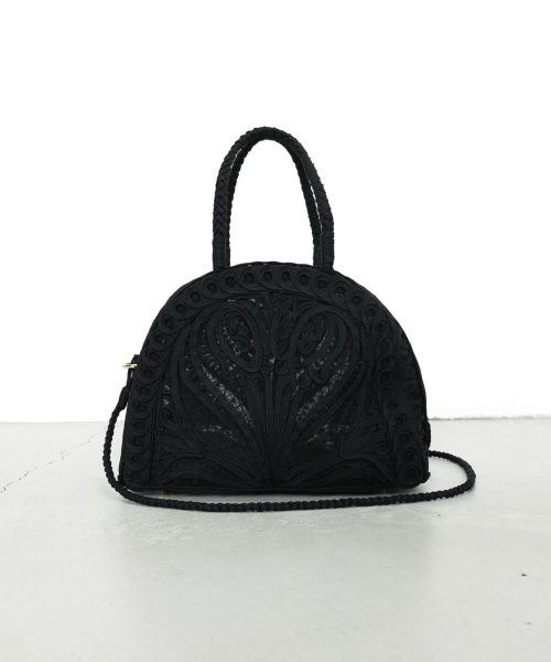 コード刺繍のテクニックを用いたアイコニックな半月型バッグ。オリジナルのリネンコードを一筆書きの要領で柄を組みながら刺繍していくことで、日本の伝統的な籠モチーフや植物からインスパイ アされた複雑な編み模様を見事に表現しています。