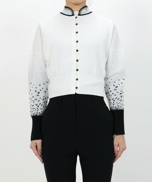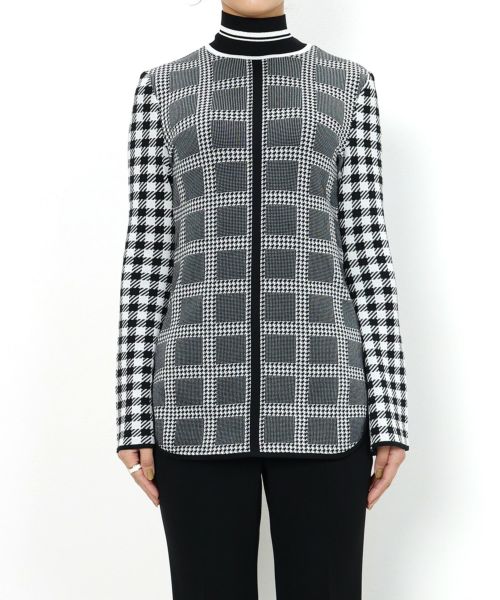 丹頂をイメージした千鳥模様を様々なバリエーションのジャガードで組むことで、グラフィカルなマルチチェック柄を表現したジオメトリックニットトップス。シーズンテーマを体現する1着となっています。