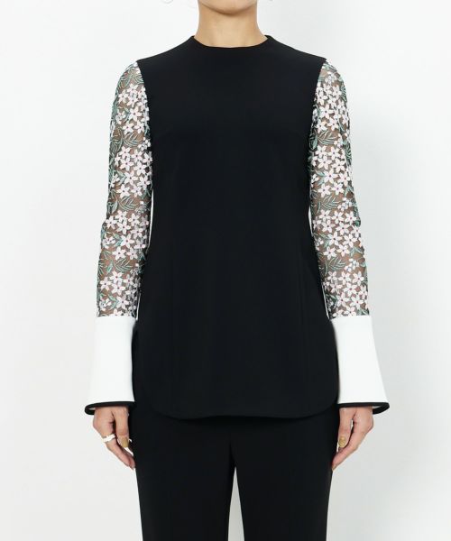 フラワーレースを用いたスリーブが印象的なトップス。アーカイブからアップデートした花柄のデザインをレースの袖をあしらい、デイリーにはもちろんオケージョンでも着用いただける一着に仕上がっています。同素材のSuit Trousers(MM23PS-PT737)とセットアップで着用いただけます。