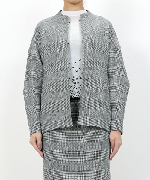 曲線のカッティングが印象的なミニマルなノーカラージャケット。