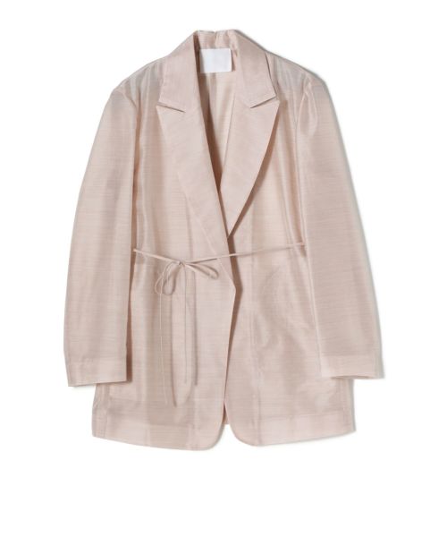氷やガラスを思わせる繊細な光沢が美しい、スパーク生地のテーラードジャケットです。全体に透け感を持たせた軽やかな表情が、ミニマルな中に凛とした存在感を与えます。ドロップショルダーによるリラクシングなシルエットは、かっちりしすぎず、エフォートレスな着心地を実現。同素材のトップスやトラウザーとセットアップでの着用も可能で、統一感のある洗練されたスタイリングが完成します。ウエストには同素材のストリングを配し、さりげない表情の変化も楽しめる一着です。