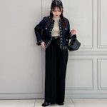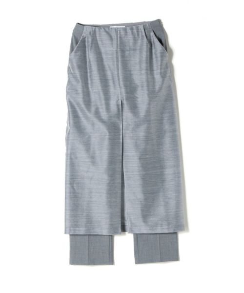 氷やガラスを思わせる繊細な光沢を放つスパーク生地のスカートをドッキングした、印象的なトラウザーズです。テーパードシルエットのパンツにシアーなスカートを重ねることで、軽やかさと奥行きを併せ持つレイヤードスタイルを実現しました。動くたびに揺れる透け感が、シンプルな佇まいの中に女性らしい余韻を添え、エフォートレスでありながら洗練された印象に。同素材のジャケットやトップスと合わせたセットアップスタイルも可能です。
