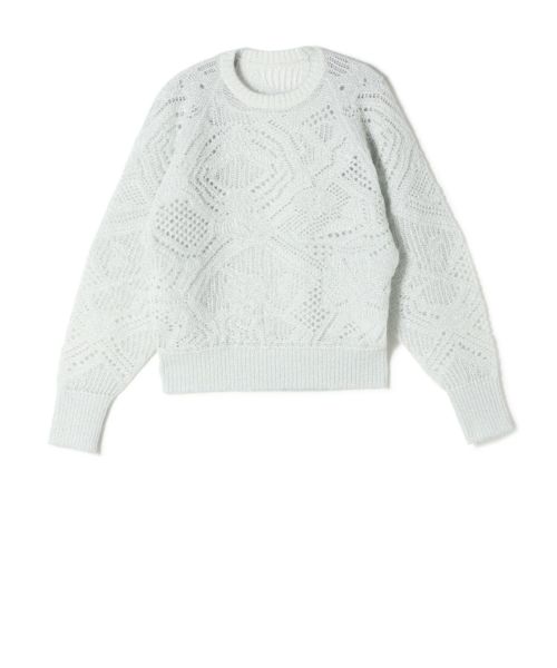 Mame Kurogouchi(マメ クロゴウチ)のニットトップ。淡い光を纏うようなフィルムの煌めきが印象的なニットトップは、センシュアルなローゲージの透け感と、丸みを帯びたラウンドシルエットが、構築的な編み柄の中にやわらかさと儚さを添えます。腰にかかるやや短めの着丈は、ドレスの上からのレイヤードや、カジュアルなボトムスとのスタイリングにも好相性。装いにさりげない輝きをプラスする、汎用性の高い一着です。