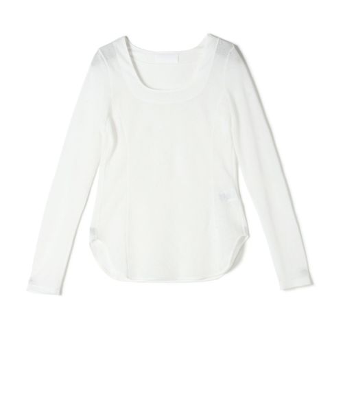 ブライトポリエステル糸による天竺ジャカードの立体的な表情が印象的なロングスリーブトップで、腕まわりにやさしくフィットするシルエットが、すっきりとしたラインを描き、装いに上品な印象を添えます。縫い代をステッチで抑えることで、滑らかなフィッティングを実現し、カジュアルになりすぎない洗練された佇まいに。1枚でトップスとして成立するデザインでありながら、レイヤードスタイルのインナーとしても活躍する汎用性の高い一着です。