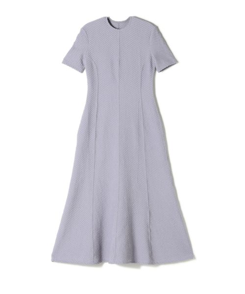 ブライトポリエステル糸を使用した天竺ジャカードの立体的な表情が魅力です。コンパクトな身頃と分量感のあるフレアスカートが美しいシルエットを描き、五分袖が腕まわりにやさしくフィットすることで、動きやすさと汎用性を両立。縫い代をステッチで抑えた滑らかなフィッティングが、カジュアルになりすぎない上品さを演出します。1枚で完成する主役級のドレスでありながら、レイヤードにも対応する柔軟なデザインです。