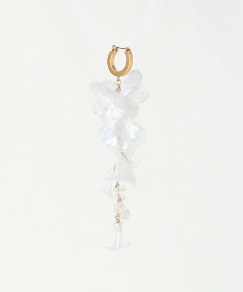 Mame Kurogouchi(マメ クロゴウチ)のピアス。まるで凍った花を閉じ込めたかのような、アシンメトリーのショートピアス。7種類の花を職人が一点ずつ手作業で仕上げ、透明樹脂を重ねることで、氷越しに覗く植物の繊細な美しさを表現しました。顔まわりにさりげなく華やかなアクセントを添えるデザインです。