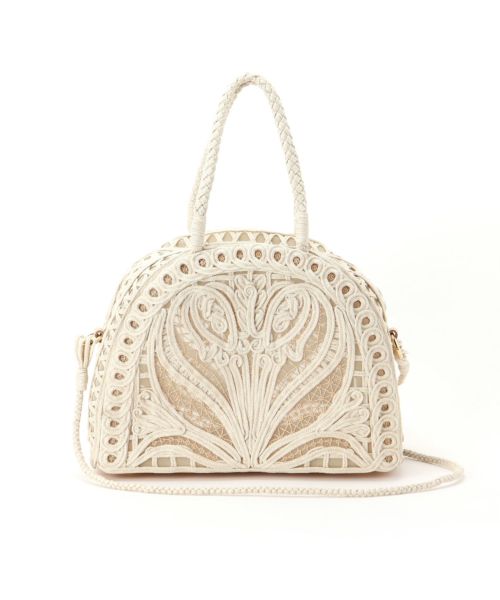 Mame Kurogouchi(マメ クロゴウチ)コード刺繍のテクニックを用いたアイコニックな半月型バッグ。オリジナルのリネンコードを一筆書きの要領で柄を組みながら刺繍していくことで、日本の伝統的な籠モチーフや植物からインスパイ アされた複雑な編み模様を見事に表現。ハリのあるチュールにコード刺繍を施すことで、しっかりとした形状を実現しています。持ち手とショルダー紐はそれぞれ手で編まれており、ショルダー紐は取り外しが可能。 ボストン型のクラシックさと、ハンドの温かみを感じられるバッグです。
