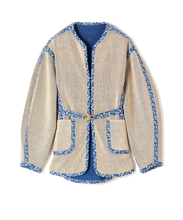 Mame Kurogouchi(マメ クロゴウチ)のジャケット。リネンとコットンレーヨンの交撚糸のダブルフェイスニットジャケットです。 しっかりと目の詰まったニットジャケットは、前身頃のパネルの切り替えラインが、ボディーラインをシャープに魅せ、初期伊万里の絵付けを思わせる柄のグラフィカルなパイピングがアクセントに。付属のウエストベルトがシルエットに強弱を生み出し、リラクシングなムードとエレガントなスタイルの共存を叶える1着に仕上げられています。