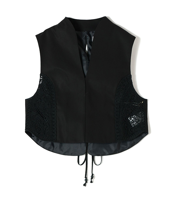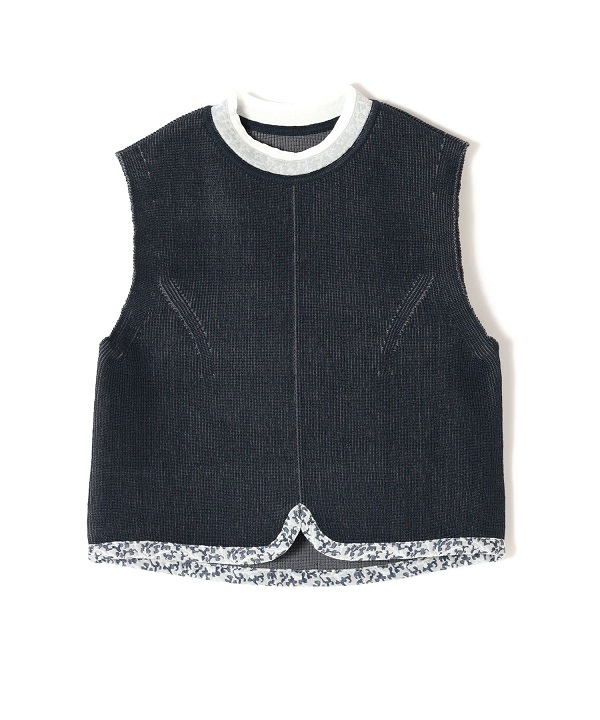 Mame Kurogouchi(マメ クロゴウチ)のニットベスト。 しっかりと目の詰まったニットベストは、コンパクトなデザインの中に初期伊万里の絵付けを思わせる柄のパイピングがアクセント。薄手のインナーをレイヤードして着用することもでき、同素材のニットジャケットとセットで着用することでエレガントな印象を与える1着に仕上がります。