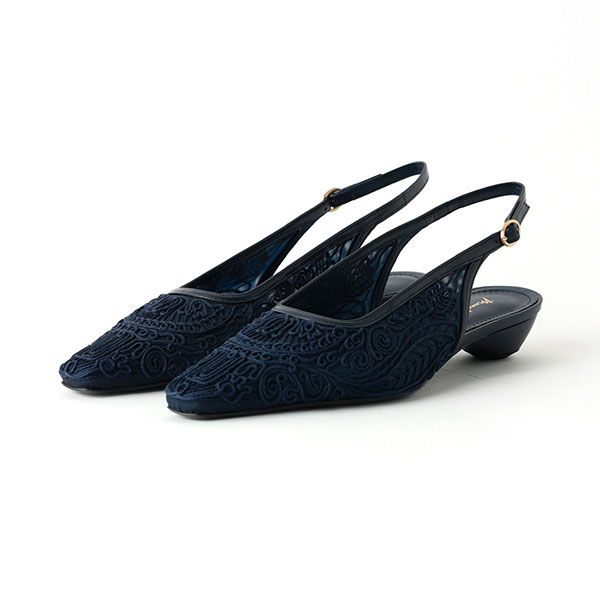 Mame Kurogouchi(マメ クロゴウチ)のコード刺繍パンプス。曲線のカッティングが印象的なコード刺繍ヒールパンプスです。コンパクトなつま先には初期伊万里の絵付け模様からインスピレーションを受けた柄がコード刺繍で表現され、ワイドなカッティングデザインと刺繍部分から透ける足元がセンシュアルな印象を与えます。アイコニックながらもプレーンなデザインのローヒールは、どんなスタイリングにも合わせやすく、装いを上品にアップデートさせる。ヒール高2.5cm。