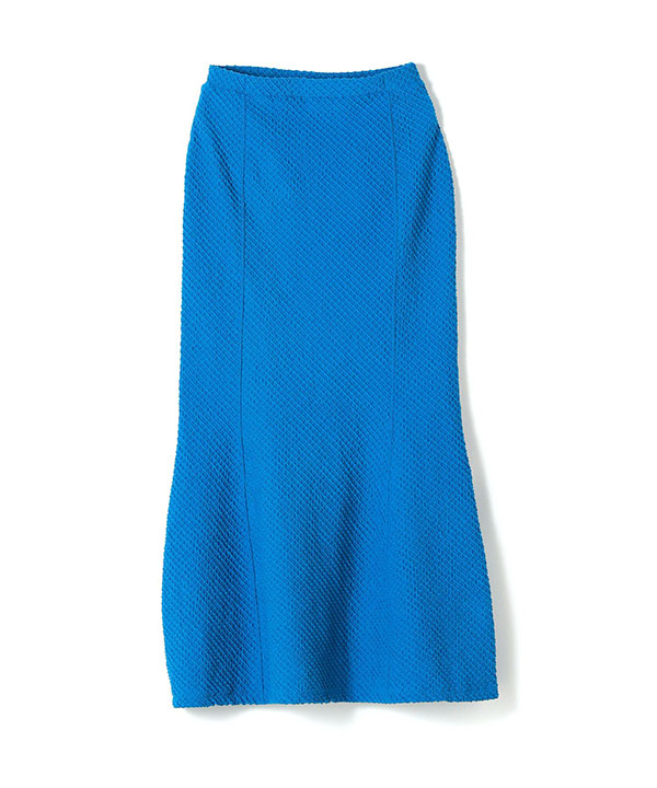 Mame Kurogouchi(マメ クロゴウチ)のスカート。 リサイクルされたブライトポリエステル糸を使用した天竺ジャカードスカートです。コンパクトな身頃とマーメイドの様な分量感が特徴的なスカートは、フォルムのコントラストが非常に美しいアイテム。縫い代をステッチで抑えることによる滑らかなフィッティングがカジュアルになりすぎない上品さを実現しています。ウエストにゴムを配すことでリラックスムードも叶える1着に仕上げられました。美しいシルエットの表情のあるスカートは、シンプルなトップスにも、デザインのあるトップスにも合わせやすい1枚。春夏のデイリールックにぴったりなスカートです。