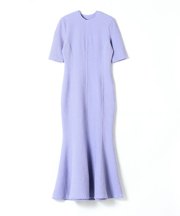 Mame Kurogouchi(マメ クロゴウチ)のワンピース。 リサイクルされたブライトポリエステル糸を使用した天竺ジャカードドレスです。コンパクトな身頃とマーメイドの様な分量感のあるスカートが特徴的なドレスは、腕周りをカバーする袖丈や、縫い代をステッチで抑えることによる、滑らかなフィッティングがカジュアルになりすぎない上品さを実現しています。フィットアンドフレアのシルエットが美しい1着です。シルエットの美しい表情のあるワンピースは、1枚ではもちろん、ベストなどとのレイヤードもお楽しみいただけます。