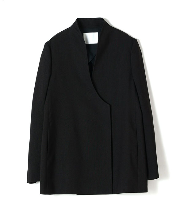 Mame Kurogouchi(マメ クロゴウチ)の美術館ジャケット。 ネックラインに沿う様な緩やかなカーブパターンが印象的なノーカラーダブルジャケットです。春夏にぴったりの涼やかな風合いのジャケットは、ノーカラーによるミニマルさと繊細なカッティングによりエレガントな印象に。肩パッドをなくすことで軽やかで心地よい着心地に仕上げ、イージーケア性を実現したハイグレードな素材が美しいカッティングにより、アイコニックなスーツスタイルを可能にする1着し仕上げられています。同素材のパンツ(MM24SS-PT047)とのセットアップもおすすめです。