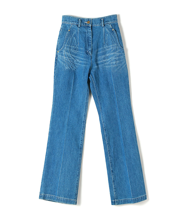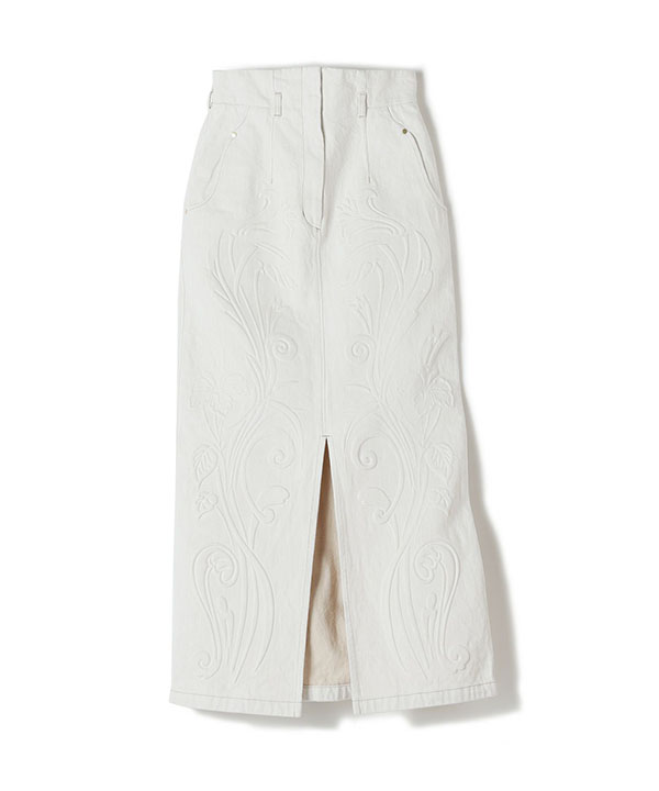 Mame Kurogouchi(マメ クロゴウチ)のデニムスカート。 凸型に浮き彫りにされた陽刻を思わせるエンボス加工が特徴的なデニムスカートです。すっきりとしたAラインのスカートは、腰から裾まで贅沢にあしらわれた草花のエンボス加工がカジュアルなファブリックに華やぎをプラスし、フレアするバックスタイルが愛らしく、センタースリットを入れることで足捌きを軽やかに演出します。ポケット口は流れるようなカーブを描き、ポケットに手を入れた時にも手の甲にカーブラインが優しく沿ってくれる1枚。細やかな柄とディテールが立体感と気品漂うエレガントな着こなしを可能にする1着です。