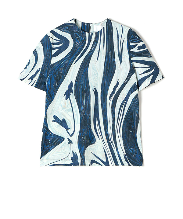 Mame Kurogouchi(マメ クロゴウチ)のトップス。初期伊万里の陶器に描かれた、日本の山水や花鳥の風景をジャカードで表現したニットトップです。 透け感のある繊細な編み地が肌をセンシュアルに演出してくれ、柄に濃淡をつけることで奥行きと深みのある表情に。袖の柄は開くとまるで1枚のお皿のように柄がつながり、正面と後ろ姿で違った表情をみせてくれる特別な1着。。後ろの袖の柄部分にコットンを多く使用することで暑い季節でも着用し易く、Tシャツタイプのデザインは日常に馴染みカジュアルなスタイルに華やさをプラスしてくれます。